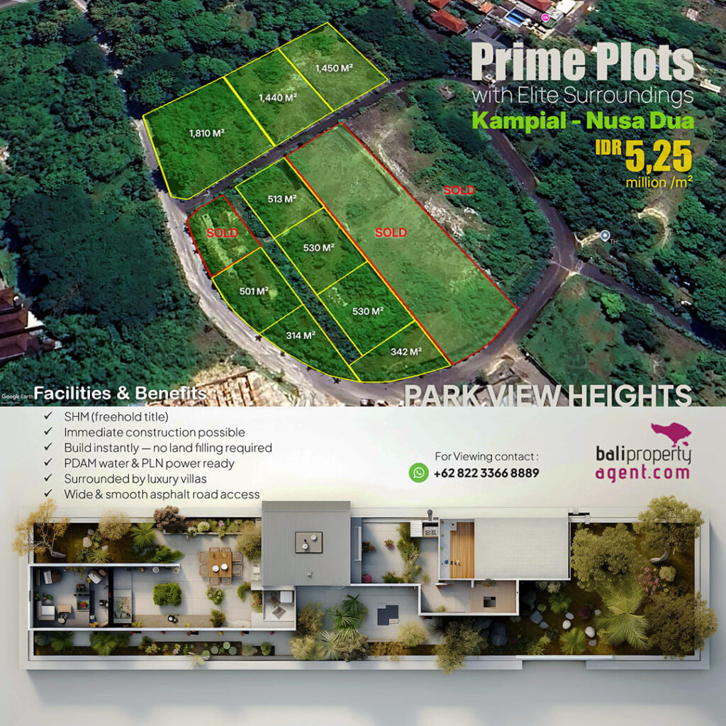 Prime land parcel in Nusa Dua, Bali, located within the prestigious Park View Heights on Jl. Dharmawangsa, Kampial. This is a rare chance to invest in a strategically located property with stunning, unobstructed ocean views and immense development potential, perfect for discerning developers and private investors.